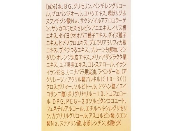 水、BG、グリセリン、ペンチレングリコール、プロパンジオール、コハクエキス、環状リゾホスファチジン酸Na、サクシノイルアテロコラーゲン、サッカロミセスセレビシアエエキス、イリス根エキス、セイヨウオオバコ種子エキス、ダイズ種子エキス、ヒメフウロエキス、プエラリアミリフィカ根エキス、ブドウつるエキス、プルーン分解物、マンダリンオレンジ果皮エキス、メリアアザジラクタ葉エキス、ユズ果実エキス、コレステロール、イランイラン花油、カニナバラ果実油、ラベンダー油、(アクリレーツ/アクリル酸アルキル(C-10-30))クロスポリマー、ソルビトール、(ベヘン酸/エイコサン二酸)ポリグリセリルー10、トコフェロール、DPG、PEG-20ソルビタンココエート、フェネチルアルコール、エチルへキシルグリセリン、カプリリルグリコール、アスコルビン酸、クエン酸Na、ステアリン酸、水添レシチン、水酸化K